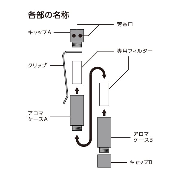 <材質> アロマケース/アルミ クリップ/ニッケルメッキ 専用フィルター/合成繊維